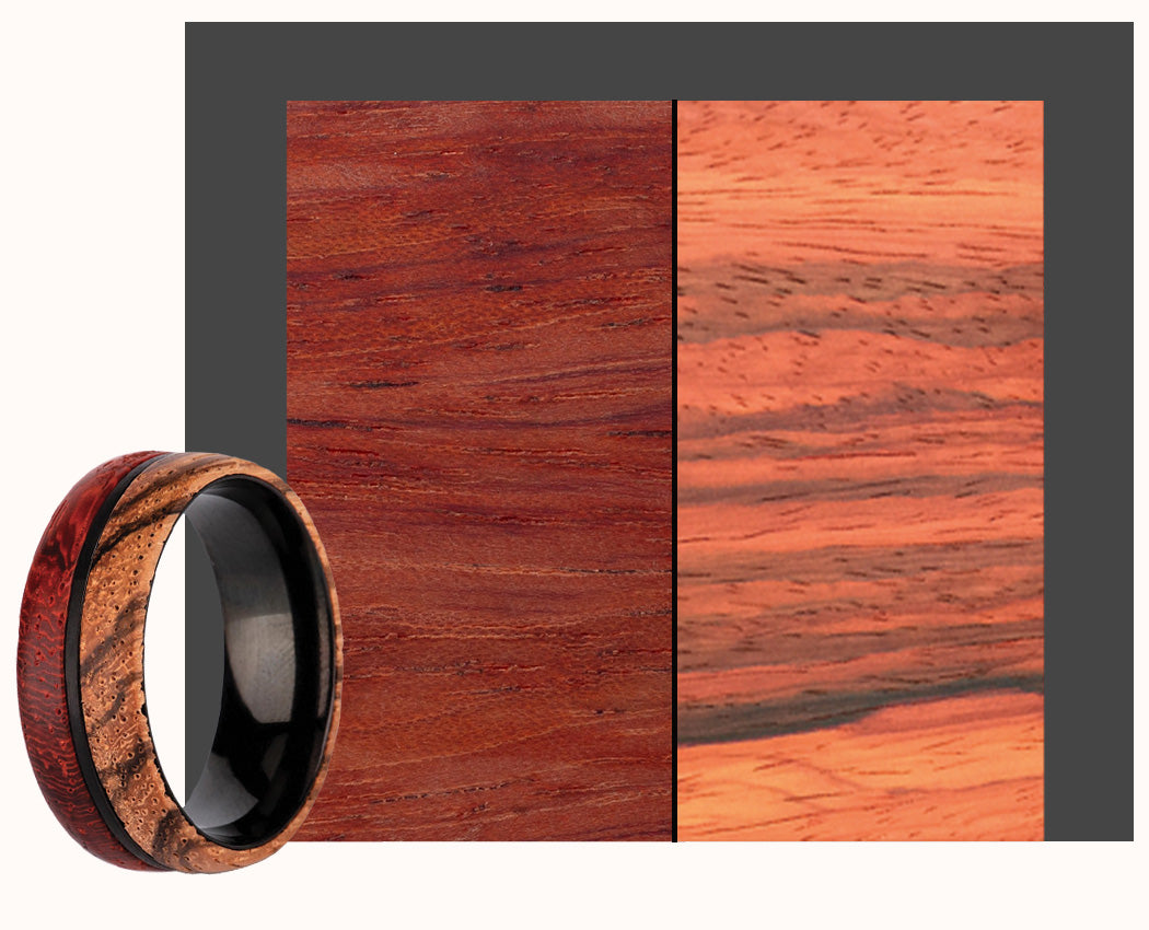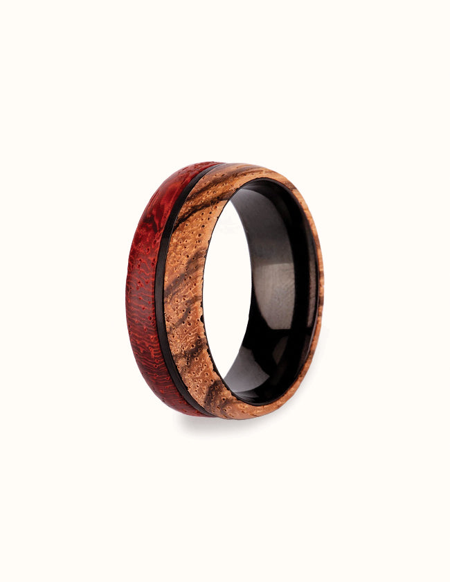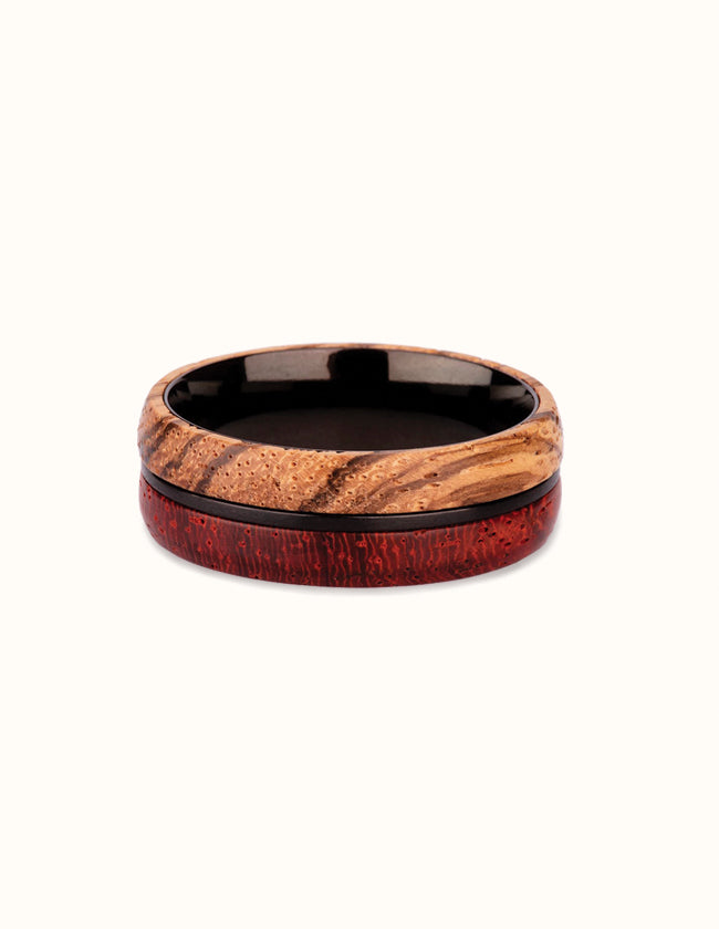 Véritable prouesse de menuiserie, l’intérieur du bijou est habillé d’un rond en titane qui rigidifie l’anneau. La monture arbore quant à elle deux bois différents. Vous y trouverez un bois zébré aux couleurs crème et un bois rouge parsemé de fines nervures. Cet ensemble de couleurs raffinées apporte à cette pièce artisanale un raffinement inéluctable.