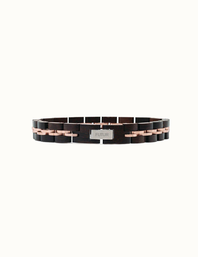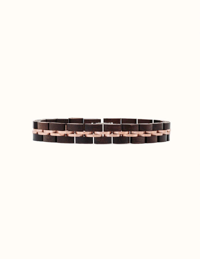 Ponctuez votre look de tonalités naturelles avec cette création artisanale mêlant sublimement matière noble et acier inoxydable 316L. Teintés d’or rose, les maillons en métal permettent de souligner la beauté du bijou et les nervures du bois. Riche de détail, ils s'enchevêtrent et forment une chaîne magnifique et solide.