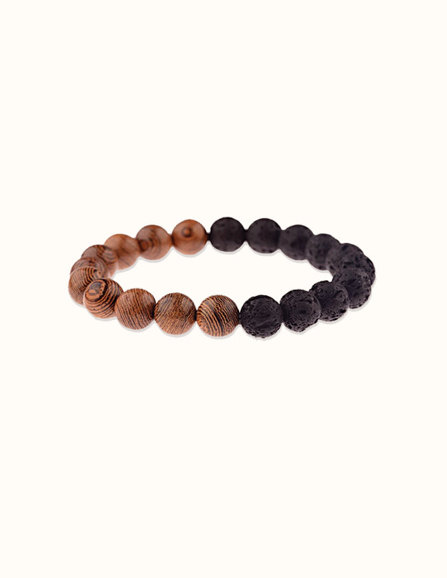 Inspiré des bracelets mâlâ traditionnelles, il vous séduira par son élégance. Ce bijou est divisé en deux et présente des perles de bois et de pierre de lave. Ce minéral constitué de dioxyde de silicium se crée lorsque du magma volcanique refroidit.