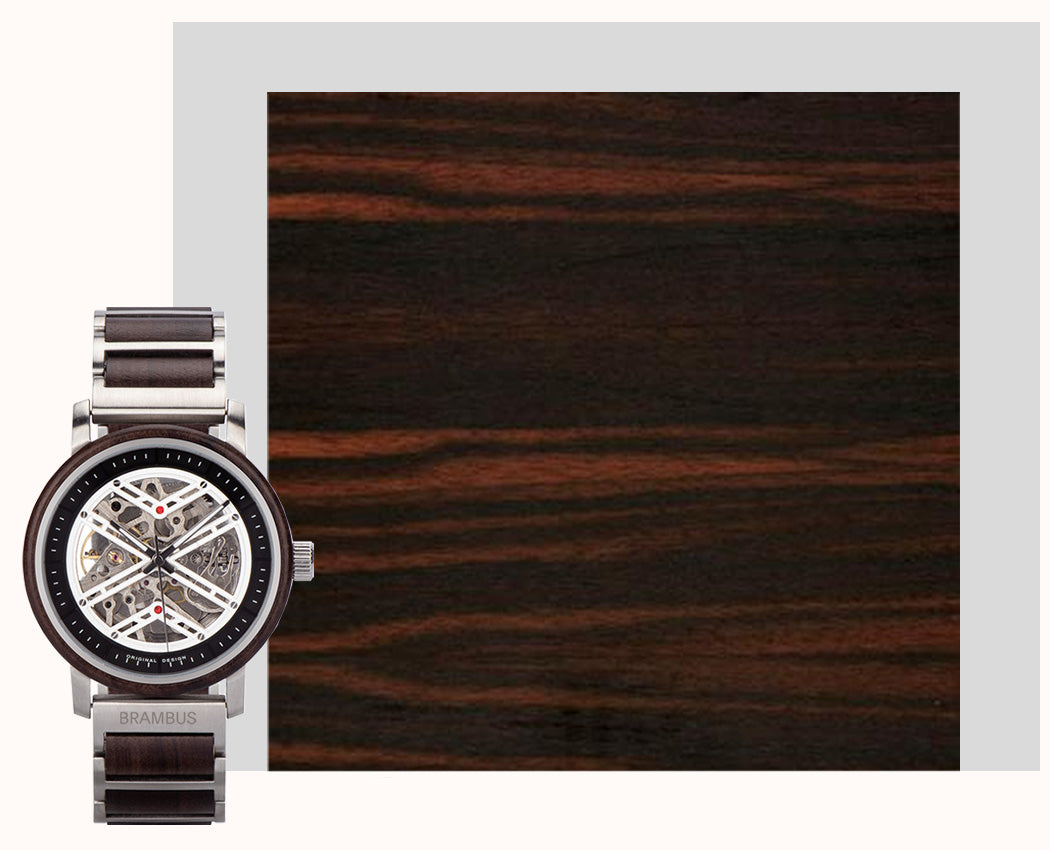 La maison horlogère Brambus est fière de vous présenter son dernier modèle automatique. Réalisée à la main par des artisans au savoir-faire centenaire, cette montre est réalisée en bois de Chacate Preto et en acier 316L. Disponible en deux variantes, l’une est de couleur bleue lorsque l’autre est en argent. Avec un diamètre de 44 mm pour une épaisseur de 14 mm, elle sera idéale pour l’avant-bras de ces messieurs. Au niveau du cadran, celui-ci dévoile l’ensemble des mécanismes qui animent le bijou. Pour le protéger des coups et rayures, il est surmonté d’un solide verre en saphir enduit. Vous pourrez ainsi la porter au quotidien sans craindre de le casser. Du côté des trois heures, vous trouverez une traditionnelle couronne remontoir. Elle vous laissera régler les aiguilles du cadran à votre convenance. De plus, à l’aide de son fond de boîte vissé transparent, elle pourra résister aux éclaboussures tout en vous laissant admirer le mouvement automatique.