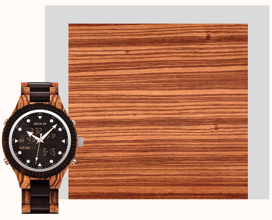 Voici une somptueuse pièce horlogère présentant un look sportif qui réunit une montre digitale de grande qualité et un bois zébré.