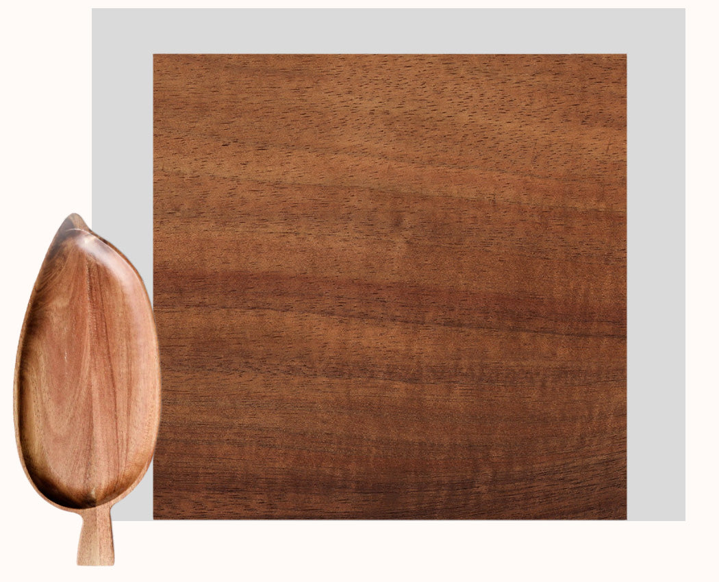 Affichant une finition polie et vernie avec une cire naturelle laissant visible les détails du bois brut, la matière y est magnifié. Les nervures et veinures ressortent élégamment, pour en faire des plateaux d'exceptions. De plus, son design en forme de feuille lui donne, un look exotique des plus chic.