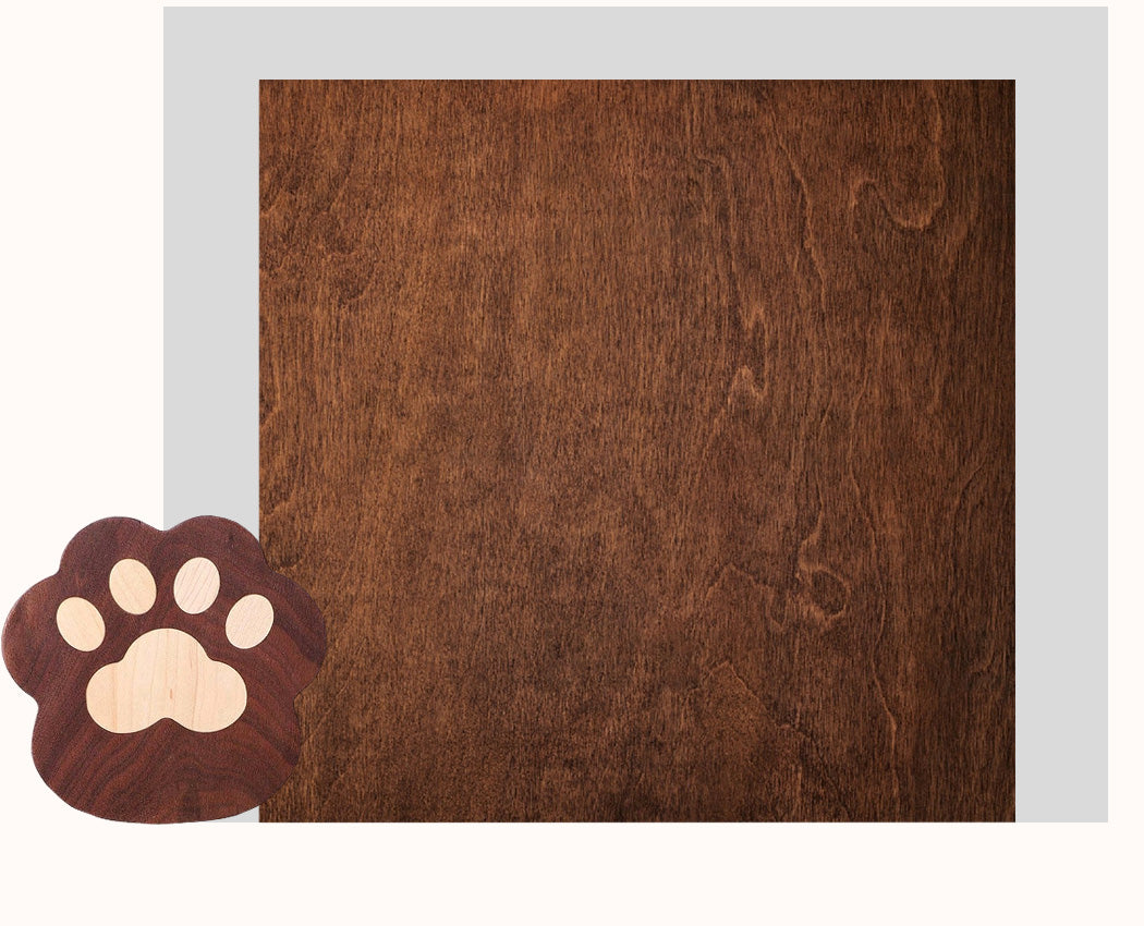 Fabriqué à la main, il représente une pâte de chat avec ses cinq coussinets. Minutieusement assemblé, le bois d’érable nuance magnifiquement avec la partie sombre en noyer massif. Pièce d’exception, chaque article nécessite une finition précise réalisée par des menuisiers au savoir-faire ancestral.