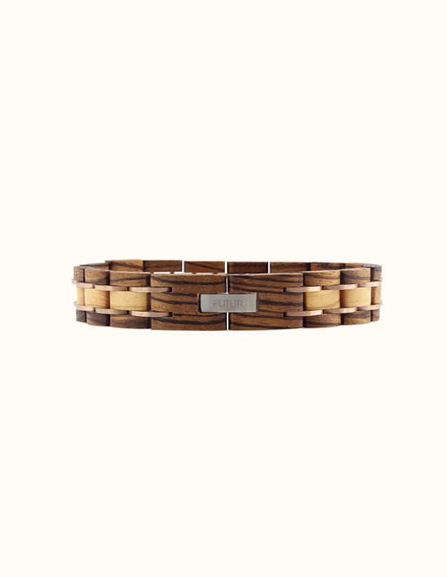 Le charme de ses matériaux mêlés à sa finition haut de gamme en font un bijou luxueux et somptueux. Très soignées, chaque maillon est poncé et assemblé avec une petite bague dorée. Pour contraster le zingana, un bois clair vient habiller le milieu de la pièce. Sobre et chic, il fait ressortir les zébrures de la matière. Véritable bijou d’exception, chaque modèle nécessite un travail artisanale et une expertise sur-mesure.